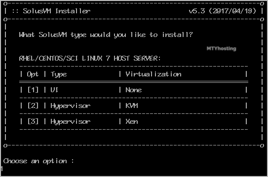 Then, it will display an option, allowing you to choose virtualization. Since we are going to install SolusVM Master, we will choose Option 1.