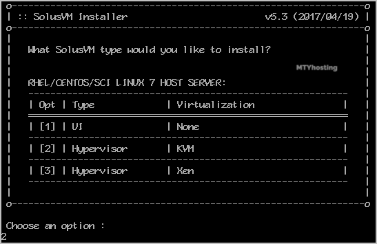 Then it will show you an option to choose virtualization. Most people prefer KVM and others Xen. Select your preferred virtualization by typing 1 or 2 and then press Enter. For KVM, we enter 2 and then hit Enter.